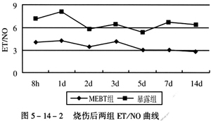 (1) Ѫ½¬ET¡¢NO²â¶¨Ð§¹û:Õý·²ÈËѪ½¬ETÖµ42.8¡À12.2pg/ml,NOÖµ14.5¡À3.6mol/L£¬£¬£¬£¬£¬ £¬ET/NOÖ®±ÈԼΪ2.95¡£¡£¡£¡£¡£ ¡£¡£¡£±í5-14-3¼ûÁ½×éÉ˺ó8hѪ½¬ETѸËÙÉÏÉý£¬£¬£¬£¬£¬ £¬µ«MEBT×éÔÚ¸÷ʱÏàÉÏÉýˮƽ¾ùµÍÓÚ¸ÉÔï̻¶ÁÆ·¨×飬£¬£¬£¬£¬ £¬5Ììºó»Ö¸´µ½Õý³£Ë®Æ½£¬£¬£¬£¬£¬ £¬¸ÉÔï̻¶ÁÆ·¨×éÔÚÉ˺ó14ÌìÈÔά³Ö½Ï¸ßˮƽ¡£¡£¡£¡£¡£ ¡£¡£¡£±í5-14-4¼ûÁ½×éÉ˺ó8hѪ½¬NO¾ùѸËÙÉÏÉý£¬£¬£¬£¬£¬ £¬1ÌìÆðMEBT×éÖð½¥Ï½µ£¬£¬£¬£¬£¬ £¬3Ììºó»Ö¸´µ½Õý³£Ë®Æ½£¬£¬£¬£¬£¬ £¬¸ÉÔï̻¶ÁÆ·¨×é7Ììºó²Å»Ö¸´µ½Õý³£Ë®Æ½¡£¡£¡£¡£¡£ ¡£¡£¡£Í¼5-14-2¼ûMEBT×é1ÌìºóET/NO¾ÍÇ÷ÏòÓÚ2.95£¬£¬£¬£¬£¬ £¬¶ø¸ÉÔï̻¶ÁÆ·¨×é¸÷ʱÏàET/NOÔ¶¸ßÓÚ2.95¡£¡£¡£¡£¡£ ¡£¡£¡£