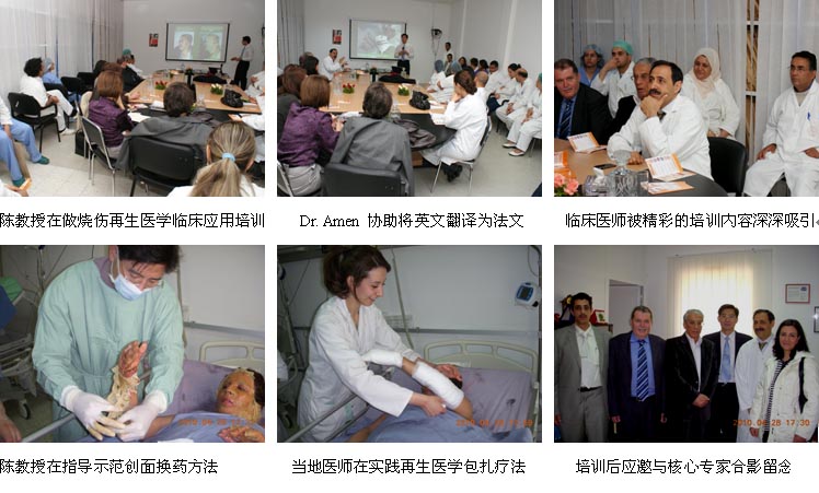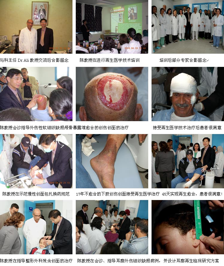 应突尼斯整形烧伤外科学会和多家医院的约请,,,,,中国烧伤创疡科技中心临床部主任、北京荣祥再生医学研究所副所长、北京中西医团结学会烧伤专业委员会副主任委员、中国烧伤创疡杂志社副社长陈永翀教授于2010年4月26日至30日来到了地处非洲北部的突尼斯,,,,,加入了天下烧伤整形学术年会并到多家医院举行培训演讲、学术交流、到烧伤中心树模指导烧伤创疡病例的治疗等,,,,,很受外地的医师、护士和患者的欢迎。 。。 。。 。。。在短短的4天的时间里,,,,,乐成加入了国家级学术交流聚会并做主题演讲,,,,,来自天下的烧伤、整形和创伤外科专家35人出席了聚会,,,,,收到较好的学术推广、规范临床手艺的效果;;;;;乐成举行市级培训班1期,,,,,培训医护职员50余名;;;;;举行院内培训班2期,,,,,培训医护职员40余名;;;;;培训经销商的医疗开发职员6名;;;;;会诊、指导2例烧伤患者的治疗和5名创疡患者的治疗。 。。 。。 。。。实现了较好的开发效果,,,,,现以图片的方法做一个简报。 。。 。。 。。。
