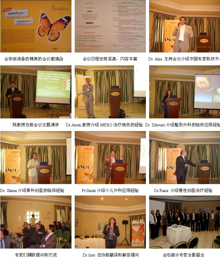 3、2010年4 月29日,,,,,突尼斯国家级烧伤、创伤外科学术交流会在Acropole Hotel聚会室举行,,,,, 学术交流会有Dr.Alaa Haleil主持,,,,,来自天下3个主要都会的10多家医院的30多名烧伤、整形、创伤外科医师加入了学术交流会,,,,,陈教授以“Burns Regenerative Medicine and Therapy in Burns, Wounds and Ulcers treatment” 为题做了主题演讲。 。。 。。 。。。另外,,,,,尚有6名专家教授在交流会上先容了他们近年来应用MEBO治疗烧伤、创伤和溃疡的临床履历,,,,,学术气氛浓重,,,,,各人都以为这是一次很是难堪的交流和学习的时机,,,,,希望以后每次学术年会都有新手艺和洽履历的先容和交流。 。。 。。 。。。
