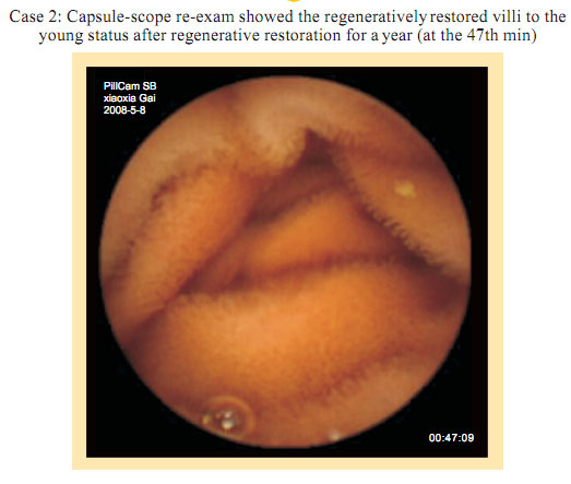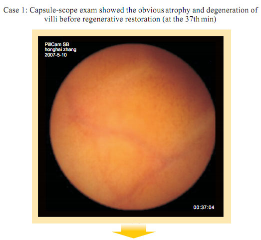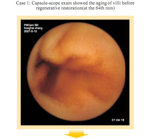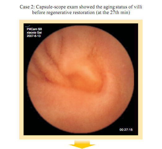 Capsule Endoscopy observation before gastrointestinal regenerative restoration: Atrophy, attenuation, the submucosal vascular net are obviously observed at the intestinal mucosa and the submucosa. Small villi are sparse, length shortened, degraded, villi in some area completely exfoliated. Fossae become shallow. The villi area becomes small. Gastrointestinal mucosal system presents the condition of aging.