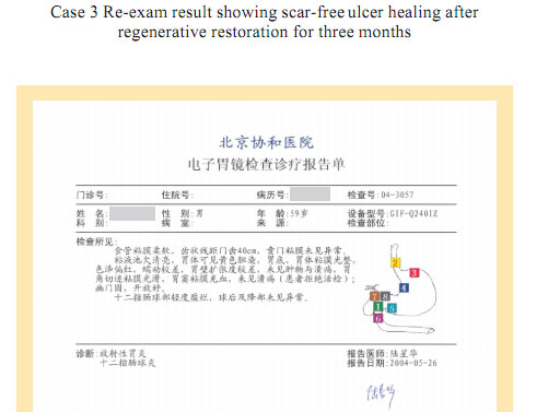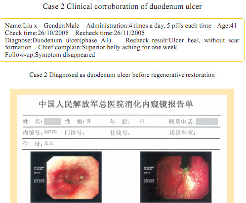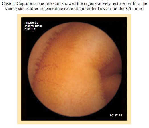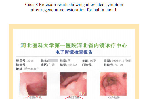 Case 1: Name: Zhang, Gender: Male, age: 56. He started the gastrointestinal regenerative restoration program from May 2007.After half year’s participation, the gastrointestinal system are mostly regenerated and restored and the physical signs of mucosa demonstrates younger state.