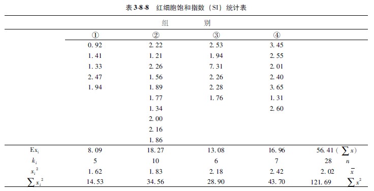 示例382测得轻度、中度、重度、特重度烧伤病人的红细胞饱和指数(SI,,,, ,,,正常值为09~11)纪录于下(表388),,,, ,,,问四种水平的烧伤病人红细胞饱和指数(SI)有无显著差别??? ????