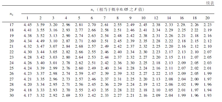 5效果判断F婢例自由度n1为3,,,, ,,,n2为24,,,, ,,,查F表:F005=301,,,, ,,,F001=472,,,, ,,,本例F=356,,,, ,,,大于F005=301,,,, ,,,但小于F001=472,,,, ,,,即005>P>001。。 。。。。。。
