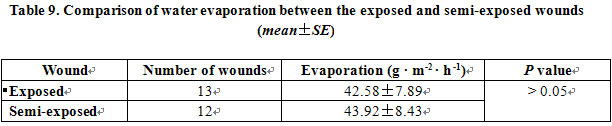 During the liquefaction period, deep wounds were treated with exposed or semi-exposed method, the two methods did not result in a significant difference in wound water evaporation (P>0.05, Table 9).