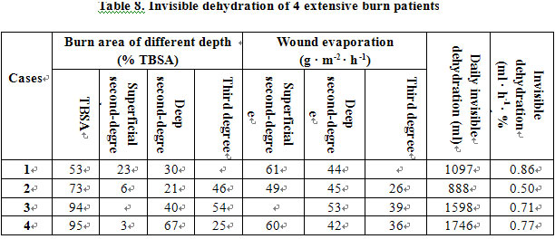 In 4 extensive burns patients with burn area over 50 % TBSA, their total body surface area and burns areas were measured. Daily water evaporations of the wounds with different depths were calculated, respectively. Then invisible dehydration per hour per 1% of second- and third-degree wounds can be obtained. The average value was 0.71 ml • h-1 • % TBSA-1 (Table 8).