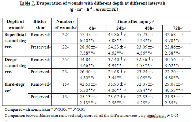 Normal skin water evaporation of the 25 burn patients had an average value of 18.48±5.02 g • m-2 • h -1. Wounds were classified according to their depths and one typical wound from each degree was selected randomly. Blister skin (necrotic epidermis) of every selected typical wound was divided in half with one half remaining intact and the other half having its protective skin removed. Then the evaporation of both halves of the wound was measured, respectively. The results revealed that water evaporation in wounds with preserved epidermis had a very significantly lower evaporation capacity than those with epidermis removed (P<0.01). Water evaporation reached its peak at 6 h postburn and then decreased, but still remained markedly higher than that of the normal skin (P<0.05). For very deep wounds, water evaporation of wounds with epidermis tended to decrease (P<0.05), while evaporation in wounds with preserved epidermis did not decrease significantly (P>0.05, Table 7).
