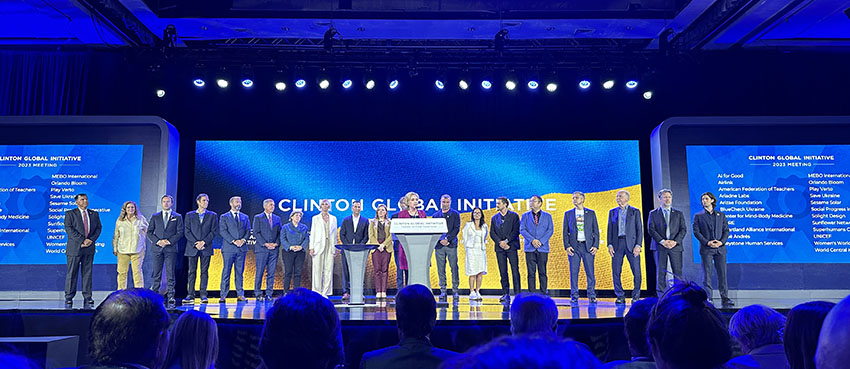 外地时间2023年9月19日,,,,,,zoty中欧体育集团董事局主席徐鹏作为2022 CGI建议“欧洲修复妄想”提倡人应邀登上克林顿基金会CGI大会主会场讲台,,,,,,与希拉里·克林顿及其他建议提倡者包括Orlando Bloom 和 Liev Schreiber一起见证新的CGI国际救助行动网络建设。。。。。