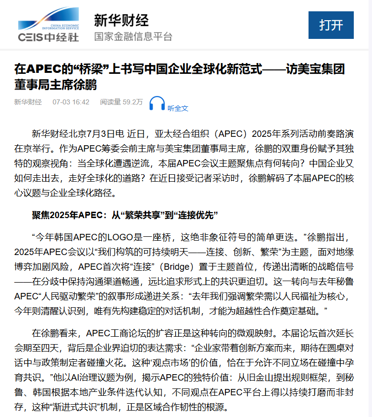 新华财经:在APEC“桥梁”上誊写中国企业全球化新范式—访zoty中欧体育集团董事局主席徐鹏