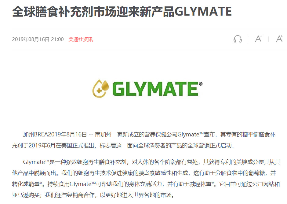 加州BREA2019年8月16日 -- 南加州一家新建设的营养保健公司Glymate™宣布,,,,,,,其专有的糖平衡膳食增补剂于2019年6月在美国正式推出,,,,,,,标记着这一面向全球消耗者的产品的全球营销正式启动 。。。。 。