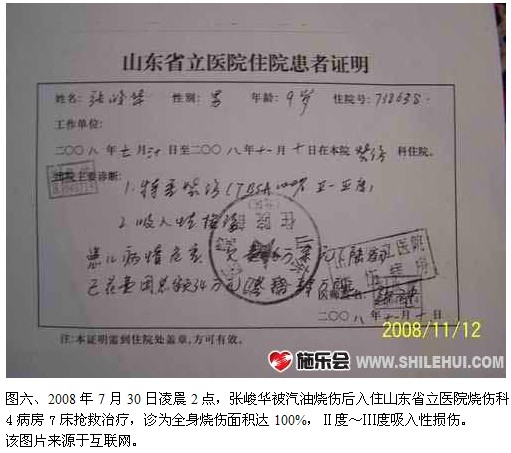 张某某于三年前的一天(2008年7月30日)破晓2点,,,,,,,同睡的妈妈听到燃烧的爆裂声醒来,,,,,,,发明身边的孩子竟被燃烧,,,,,,,灭火后即被送到山东省立医院烧伤科抢救治疗,,,,,,,经由医生检查确诊为全身烧伤面积达100%,,,,,,,Ⅱ度~Ⅲ度;; ;;;;;吸入性损伤而住院近三年。。。。。。历经大型植皮手术十六次和多次换药疼痛出血的折磨,,,,,,,现在皮肤已基本植全却不可再生长了,,,,,,,孩子虽顽强的生涯了下来,,,,,,,但疤痕累累,,,,,,,严重残疾并损失了正常的生涯能力。。。。。。一样平常以为,,,,,,,12岁的张某某随着年岁变大,,,,,,,发育的骨骼与缩短的皮肤之间会越来越冲突。。。。。。必需隔一段时间在骨骼生长的地方把皮肤切开再植皮,,,,,,,云云一连到张某某不再长身体为止。。。。。。由于缺乏正常皮肤,,,,,,,疤痕修复难题。。。。。。