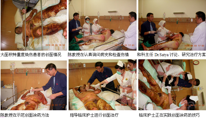 3、8月3日下昼,,,,,,陈教授一行完成了在Fatmawati hospital的培训使命后,,,,,,马上又应邀到雅加达市的Harapan Bunda hospital会诊、指导一例大面积特重度烧伤的患者。。。。 。。该患者是一名男性,,,,,,47岁。。。。 。。因被火焰烧伤全身而入院。。。。 。。临床诊断:1、大面积特重度烧伤(75%TBSA深II度---深III度);;;;;;;2、中度吸入性损伤。。。。 。。由于患者烧伤面积大、深度深,,,,,,且是该院收治的第一例特重度烧伤患者,,,,,,为了更好地使用烧伤再生医学手艺治疗该患者,,,,,,医院专程约请陈教授对该患者举行会诊和指导。。。。 。。陈教授到了病房后首先听取了病情汇报,,,,,,然后认真询问了病史、查阅了病历资料、照顾护士纪录和举行了详尽的体格检查,,,,,,并团结该病例的详细伤情和情形,,,,,,提出了一整套详细的全身系统治疗和创面治疗计划。。。。 。。讨论和制订了治疗计划后,,,,,,陈教授亲自为各人树模了深度烧伤痂皮的耕作减张手艺和烧伤湿润袒露疗法的创面治疗要领。。。。 。。