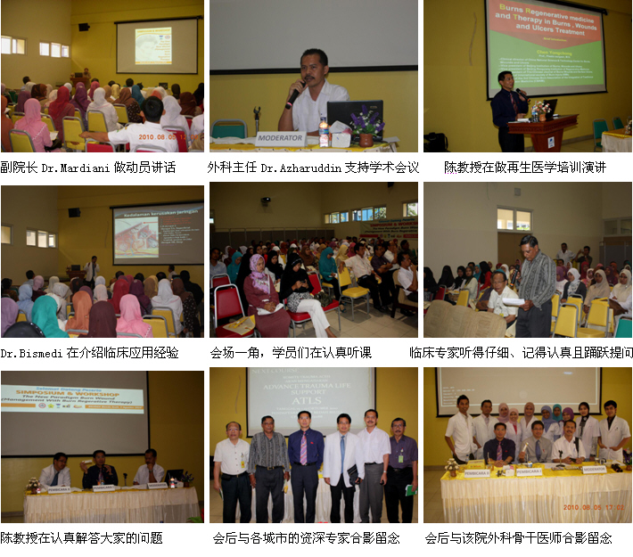 同时,,,,,,经由全心策划和安排,,,,,,2010年8月1日,,,,,,刚刚竣事马来西亚医疗开发与维护事情的中国烧伤创疡科技中心临床部主任、北京荣祥再生医学研究所副所长、北京中西医团结学会烧伤专业委员会副主任委员陈永翀教授顾不上休息,,,,,,便马一直蹄地赶往印度尼西亚(印尼),,,,,,在Combiphar 认真医疗开发的Mr. Kirastha 的组织、安排和全程陪同下,,,,,,睁开了印尼2010年的第二轮医疗开发事情。。。。 。。在这次的医疗开发事情中,,,,,,能够很好地和各级医师学会或医院细密合作,,,,,,有用地提高了培训班的组织能力、影响力、学术水一律,,,,,,由于有继教学分并且培训内容新颖、适用,,,,,,而很受临床医护职员的欢迎,,,,,,为医疗开发探索出了一条很好的路子。。。。 。。在这次的医疗开发历程中,,,,,,通过这种模式乐成加入了印尼天下的烧伤整形外科大会,,,,,,举行了省级培训班2期,,,,,,市级培训班3期,,,,,,院内培训班2期,,,,,,重点专家学术交流5次,,,,,,培训了烧伤、整形、通俗外科、皮肤科、骨科、妇产科医师和护士690多名,,,,,,培训市场医疗开发职员19名,,,,,,乐成开发了不少于5家大型政府教学医院,,,,,,会诊、指导1例大面积特重度烧伤和另外5例创疡患者的治疗。。。。 。。由于开发的路子对,,,,,,抵达了高效率的开发效果。。。。 。。下面以简短的图文方法与各人分享乐成的履历。。。。 。。
