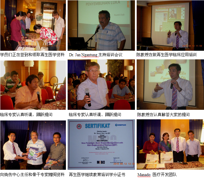 6、8月12日上午9时,,,,,,由医师学会主理的Manado省级烧伤再生医学临床培训班(省级继续教育项目,,,,,,学分8分)在Aston Hotel旅馆的聚会室里举行,,,,,,来自全省主要的4个都会的8家政府医院和其它20多家私营医院的89名临床医师、护士加入了这次培训会。。。。 。。培训会由Manado 总医院烧伤整形外科主任Dr. Jan Ngantung主持,,,,,,陈教授应邀作了“烧伤再生医学与疗法在烧伤、创疡疾病治疗的临床规范应用”的培训演讲,,,,,,很受各人的欢迎,,,,,,抵达了较理想的培训效果。。。。 。。