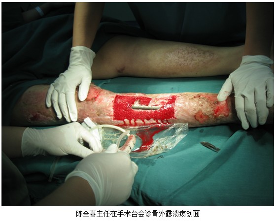 皮肤原位再生医疗手艺培训班在三门峡市中医院刚刚竣事 ,,,,,,该院骨四科罗主任约请中国中西医团结学会烧伤专业委员会委员、北京zoty中欧体育烧伤创疡研究所临床部主任陈全喜 ,,,,,,到医院会诊右下肢胫骨破损性骨折已近70天伤口不愈合的骨病患者。。。。。。