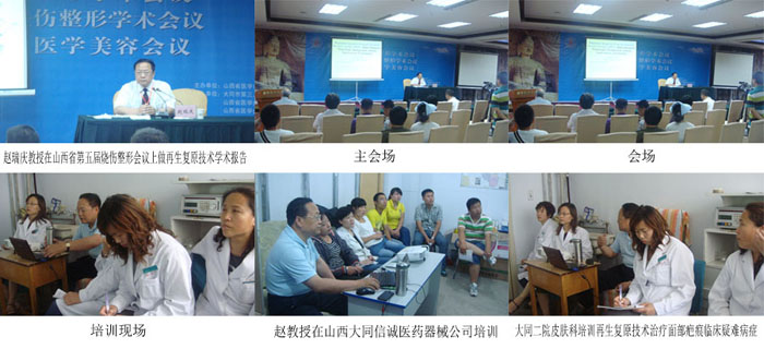 北京烧伤创疡研究所副所长赵瑞庆教授于5月27日在山西省烧伤整形学术聚会做再生回复手艺讲座,,,,,受到中外专家学者的一致好评。。。。。。。。28日至30日划分在大同信诚医药器械公司、大同市二院皮肤科举行再生回复手艺培训。。。。。。。。