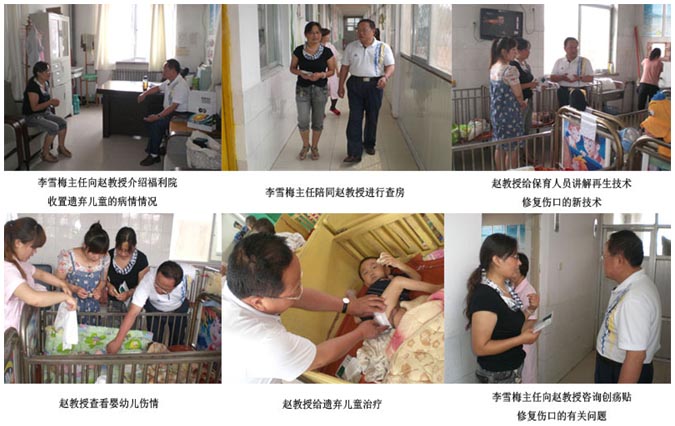 简报一:9月1日,,,,,应菏泽市福利院的约请,,,,,赵教授带着再生医学创面修复的新手艺走进福利院。。。。。。 。。在儿童部李雪梅主任的陪同下,,,,,给福利院保育职员解说预防褥疮创面修复的新知识,,,,,为遗弃儿童免费举行医疗服务。。。。。。 。。