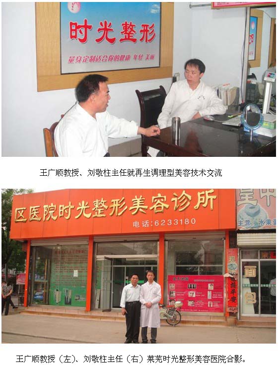 2011年5月17日~18日 ,,,,,应莱芜时光整形美容医院刘敬柱主任的约请 ,,,,,北京再生医学研究所医疗专家王广顺教授和山东服务处刘治国同志来到该院 ,,,,,就“引进应用再生回复手艺”举行了攀谈 ,,,,,告竣了“再生回复医疗手艺”产品售后服务定点协议 ,,,,,并将再生回复手艺为特色形成的美容项目界定为“再生调理型美容”项目。。。。。。