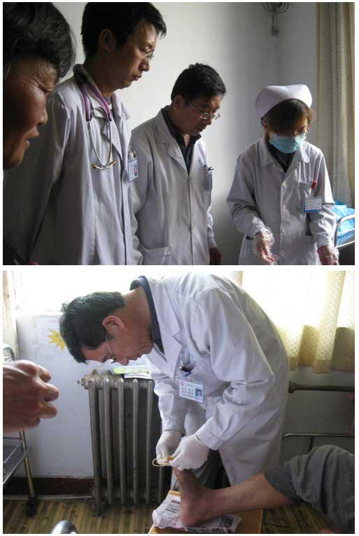 陈全喜主任与内渗透科主任龚约放、门诊主任张秀珍配合会诊了一位84岁的老干部王永新。。。。。。。。王永新患糖尿病15年,,,,,,, ,合并心衰、脑梗、右下肢动脉梗塞、右脚趾第1、2、3、4均为糖尿病溃疡创面。。。。。。。。创面溃疡已形成1年零4个月,,,,,,, ,久经治疗不愈。。。。。。。。
