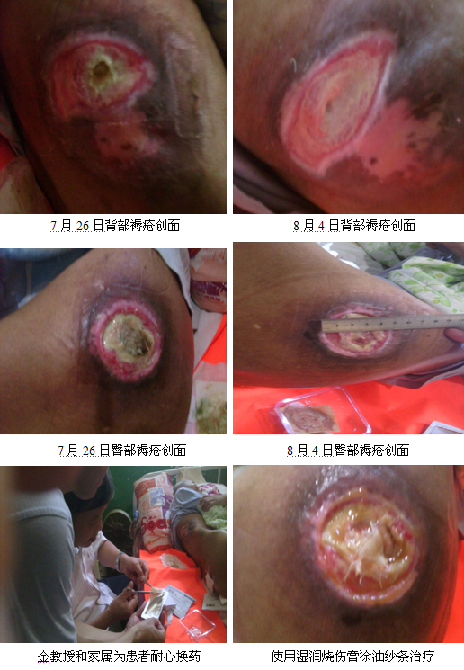 2010年8月4日,,,, ,,,北京zoty中欧体育烧伤创疡研究所金党军教授接到湖北宜昌枝江的一位褥疮患者需要会诊的新闻,,,, ,,,连忙从宜昌城区赶往枝江,,,, ,,,抵达患者家后,,,, ,,,金教授马上投入会诊。。。 。。。该患属于高龄患者,,,, ,,,恒久卧床,,,, ,,,生涯不可自理,,,, ,,,进食需流质,,,, ,,,有糖尿病史,,,, ,,,现在血糖稳固。。。 。。。该患背部,,,, ,,,骶尾骨处和臀部均有褥疮创面,,,, ,,,深浅纷歧。。。 。。。背部褥疮面达七厘米长,,,, ,,,臀部达五厘米长,,,, ,,,并有腔道。。。 。。。该患之前在宜昌市中心人民医院住院一个多月,,,, ,,,用过美皮康等泡沫敷料照顾护士创面,,,, ,,,但效果不太理想,,,, ,,,在眷属购置zoty中欧体育创疡贴后,,,, ,,,使用一个多星期,,,, ,,,创面已有好转的征象。。。 。。。金教授小心轻柔地为该患去除创面的坏死组织,,,, ,,,并涂湿润烧伤膏,,,, ,,,制作湿润烧伤膏油纱条引流到空腔,,,, ,,,最后笼罩创疡贴。。。 。。。金教授边操作边耐心地向患者眷属解说了照顾护士要点、注重事项和换药时间。。。 。。。金教授耐心、详尽的解说获得了患者及眷属的好评。。。 。。。