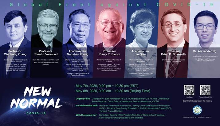 中国北京时间5月8日上午9:00(美东时间5月7日晚9点),,,,,,,国家卫健委高级别专家组组长、中国工程院钟南山院士,,,,,,,中国工程院、美国人文与科学院乔杰院士,,,,,,,上海市新冠肺炎临床救治专家组组长、复旦大学隶属西岳医院熏染病中心主任张文宏教授,,,,,,,腾讯医疗副总裁兼医疗康健事业部认真人、天下卫生组织数字卫外行艺咨询小组专家成员吴文达医生;;;;; ;; ;美国国家科学院院士、哈佛大学公共卫生学院Barry·Bloom教授,,,,,,,耶鲁大学公共卫生学院院长Sten·Vermund教授, 纽约大学朗格尼医学中心Brian·Bosworth教授等来自中外抗疫一线的重量级专家将围绕“抗击COVID-19一线履历与战略的多边分享”主题,,,,,,,共议新冠肺炎疫情防控履历与挑战,,,,,,,为全球战疫着力。。。。。