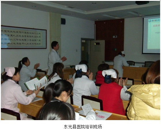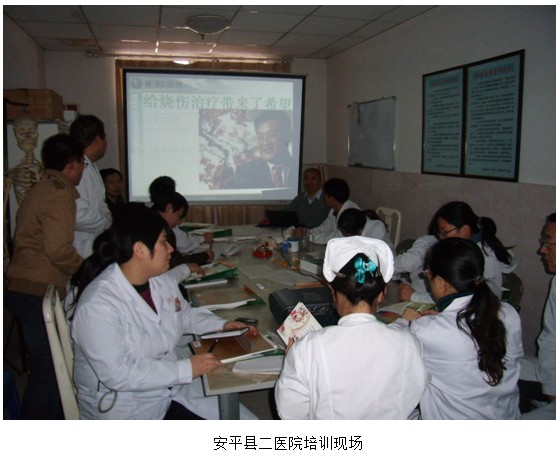 2012年11月13日及23日 ,,,,,,应安平县二医院和东光县人民医院的约请 ,,,,,,中国中西医团结学会烧伤专业委员会常委樊兆宗教授在两家医院划分院举行了“再生回复医疗手艺在创面修复中的应用”学术培训 。。。 。。。樊教授在授课中展示了大宗的临床病例图片 ,,,,,,先容了差别深度的烧伤创面及种种难愈性创伤、溃疡创面的规范化处置惩罚要领与技巧、注重事项等;;;;;;;强调了再生回复疗法在深II度和III度烧伤创面清创时要尽早举行处置惩罚 ,,,,,,加速创面的液化;;;;;;;演示了糖尿病足等难愈性创面中筋膜室减压和坏死组织彻底的清创术;;;;;;;先容了多功效敷料创疡贴的应用规模、顺应症、规范清创换药手艺等 。。。 。。。加入培训的医务职员均被这一手艺神奇的疗效所折服 。。。 。。。
