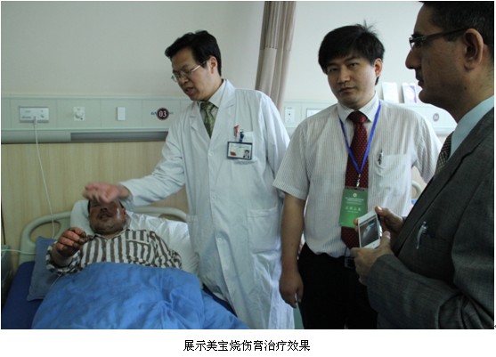 随着院方指导员的指引,,, ,,,专家们来到了此次旅行的重点部分——烧创伤科室,,, ,,,在此接待的是烧伤科的赵主任。。 。。。 。。。赵主任首先先容了zoty中欧体育再生产品在医院的使用情形,,, ,,,随后将专家们带进住院病房,,, ,,,划分通过一个烧伤病例和一个褥疮病例展示了zoty中欧体育产品在治疗烧伤创疡领域的奇异功效。。 。。。 。。。第一个病例是一个深二度烧伤病人,,, ,,,赵主任展示了经由一段时间zoty中欧体育烧伤膏的使用病人的恢复情形,,, ,,,并现场对国际专家并行了zoty中欧体育烧伤膏换药的操作树模,,, ,,,使专家团对zoty中欧体育产品有了越发周全和越发深入的熟悉。。 。。。 。。。
