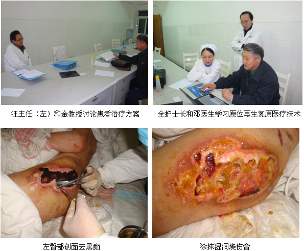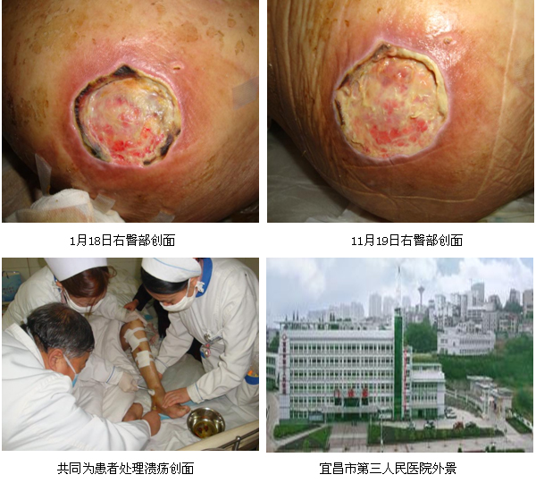2010年12月17日至12月19日,,,,,中国中西医团结学会烧伤专业委员会金党军教授在对宜昌市各医院走访时代,,,,,应该院外科汪长青主任和全丽丽护士长的约请,,,,,对刚入院的一位脑梗塞偏瘫晚年患者多发性褥疮创面举行了临床换药指导。。。。。。。该患已79岁高龄,,,,,金教授见到患者时,,,,,背部褥疮结黑痂,,,,,左臀部形成空腔,,,,,这两处面积较大,,,,,伴有恶臭;; ;;;;;另右臀部、膝盖、左小腿及左脚均有溃疡创面,,,,,并伴低卵白血糖和疝气。。。。。。。在全护士长等护士的陪同下,,,,,金教授为患者耐心地洗濯周边的创面,,,,,剪去黑痂,,,,,空腔上使用湿润烧伤膏油纱条填塞,,,,,并接纳药膏和创疡贴团结换药,,,,,金教授通过两个多小时现实操作,,,,,诠释了再生医疗手艺对创面的处置惩罚要点,,,,,随后金教授团结多媒体质料为现场的医护职员解说了再生医疗手艺在烧伤、创疡、褥疮、溃疡等创面的应用,,,,,授课竣事后,,,,,现场的医护职员体现通过看到金教授亲自为患者换药及他精彩地授课,,,,,使各人实着实在地掌握了原位再生回复医疗手艺的规范换药及其在临床各科室的普遍应用,,,,,以后会一直提高原位再生回复医疗手艺水平,,,,,救治更多患者。。。。。。。