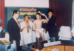 (1990年10月,,,,,,泰国卫生部长乃玛津汶(左一)在中国赴泰国烧伤医疗队救治乐成新闻宣布会上,,,,,,代表泰国向中国医生体现谢谢。。。。。。。)